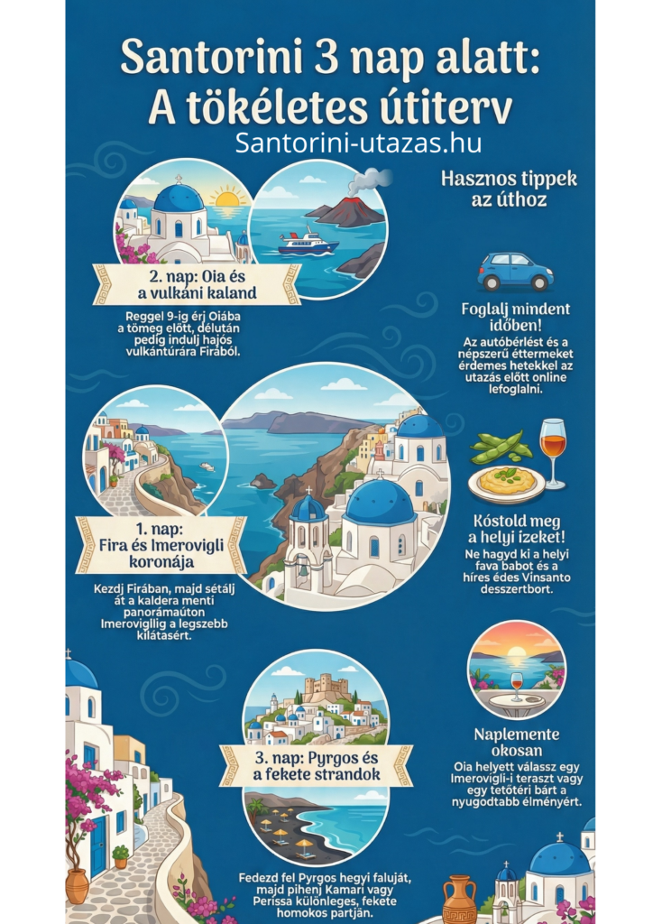 Igen, ha tudatosan tervezel. Három nap alatt belefér Oia, Fira, egy naplemente, egy különleges strand és akár egy félnapos hajókirándulás is. Viszont ez intenzív program lesz – pihenős, medencés, „csak lebegünk” nyaraláshoz inkább 4–5 nap az ideális.